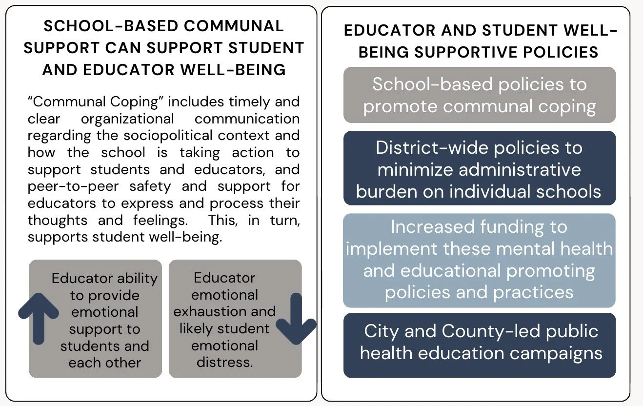 A very powerful takeaway from research done by Dr. Gabriela Barajas-Gonzalez, who listens to and amplifies educator voices, says that school policies and everyday practices can make a difference in the lives of educators and students. With the right support, schools can address the cycle of stress that negatively impacts both students and teachers. To support the mental health of their students and educators, schools can take action by having evidence-based policies in place that promote clear and timely communication and community support. These policies should offer clear steps on how educators can support one another and lay out concrete steps to take when immigration-related concerns arise. It can make a true difference when schools lead with transparency and care.